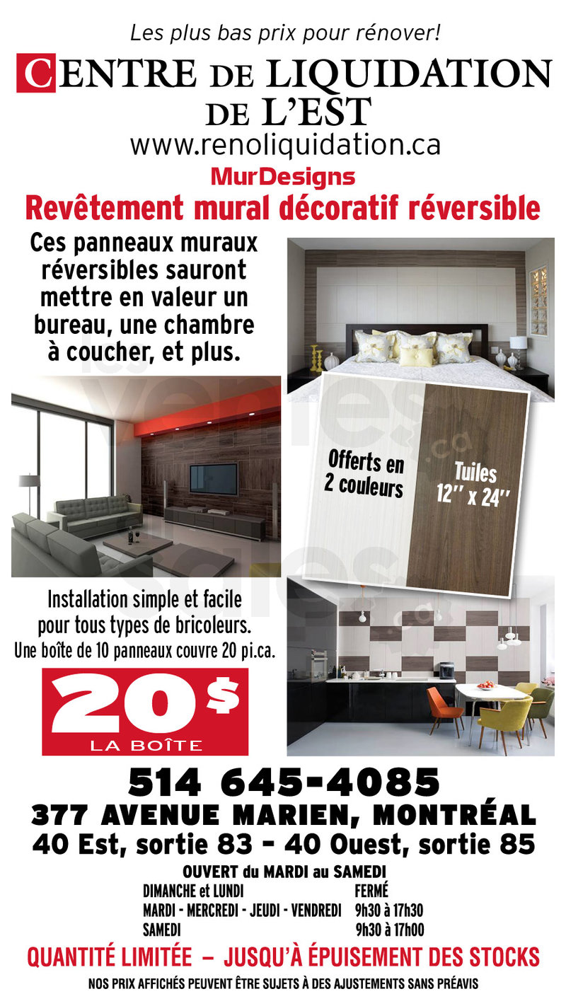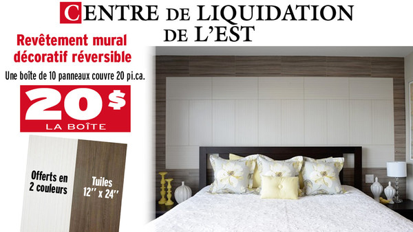 Centre de Liquidation de l'Est, les plus bas prix pour rénover! Les panneaux muraux MurDesigns sont parfaits pour mettre en valeur une chambre ou n'importe quelle pièce. Offert en 2 couleurs et facile à installer, à 20$ la boîte (couvre 20 pi.ca.).