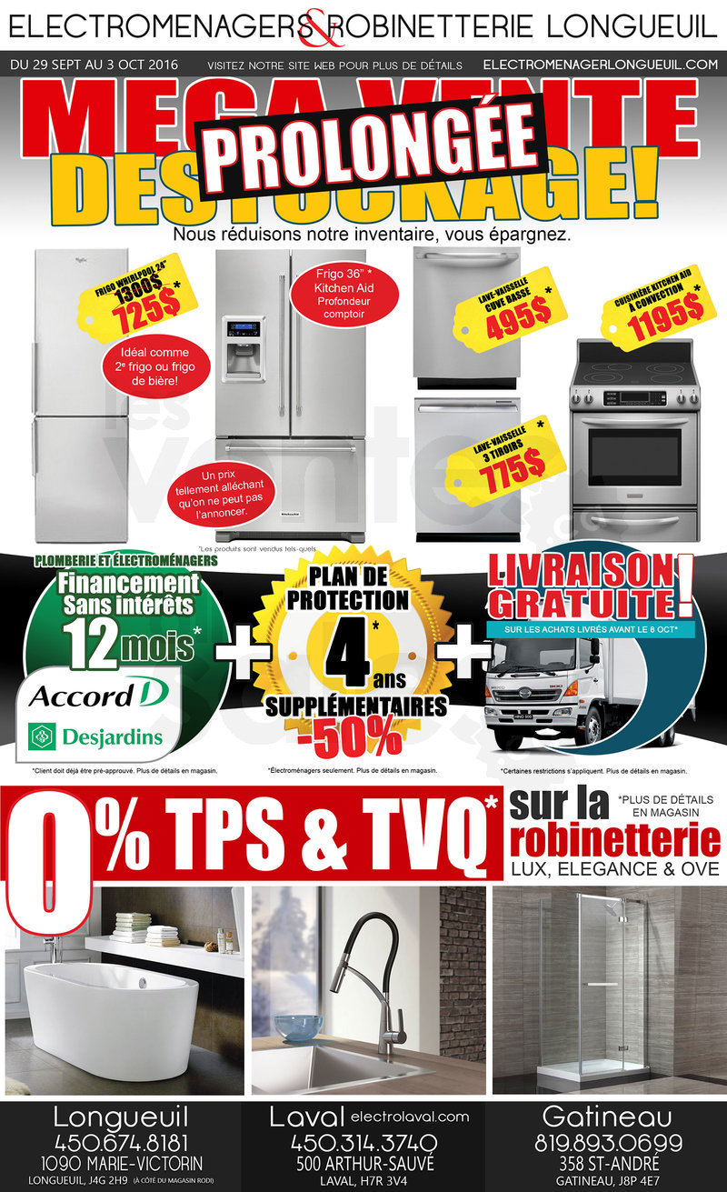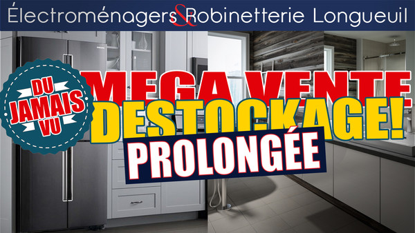 Vente prolongée! Jusqu'au 3 octobre, méga vente de déstockage chez Électroménagers & Robinetterie Longueuil. Épargnez sur des réfrigérateurs, lave-vaisselle et cuisinières de grandes marques. Financement sans intérêt 12 mois + livraison gratuite!*