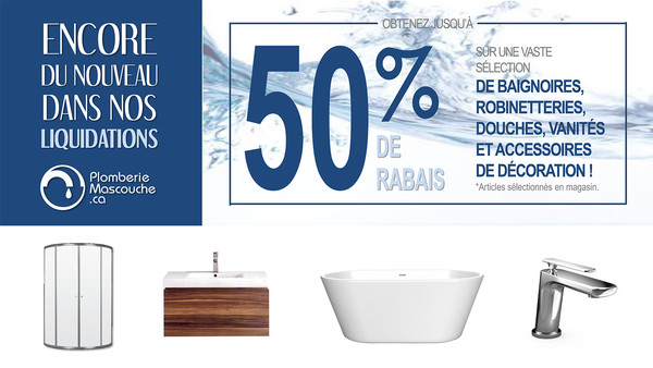 Tout doit partir! Obtenez jusqu'à 50% de rabais* sur une vaste sélection de baignoires, robinetterie, douches, vanités et accessoires de décoration. Plomberie Mascouche pour avoir les prix les plus bas, 3 magasins pour mieux vous servir!