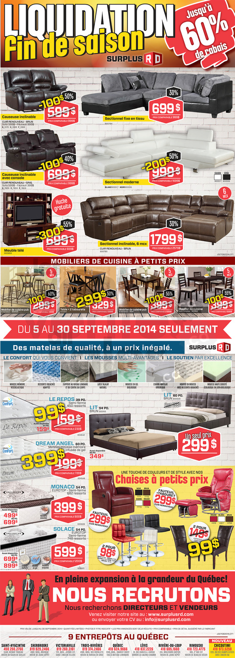Ne manquez pas la liquidation de fin de saison chez Surplus RD! Du 5 au 30 septembre seulement. Économisez jusqu'à 60% sur mobiliers de salon, inclinables, sectionnels, fauteuils, chaises, tabourets, mobiliers de cuisine, lits, matelas...