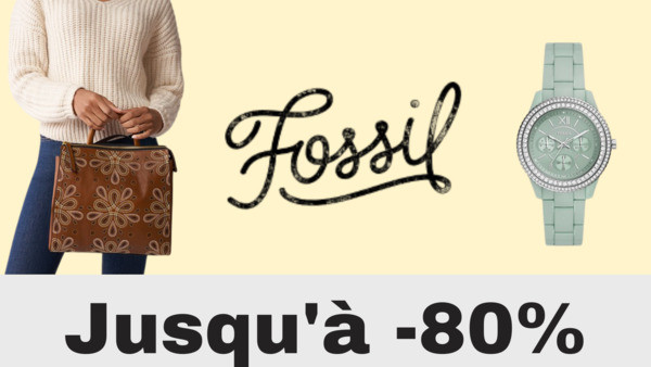 Jusqu'à 80% de rabais valable sur certains modèles à prix plein et en point de vente jusqu'au 21 août, en ligne sur Fossil.com.