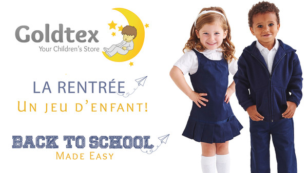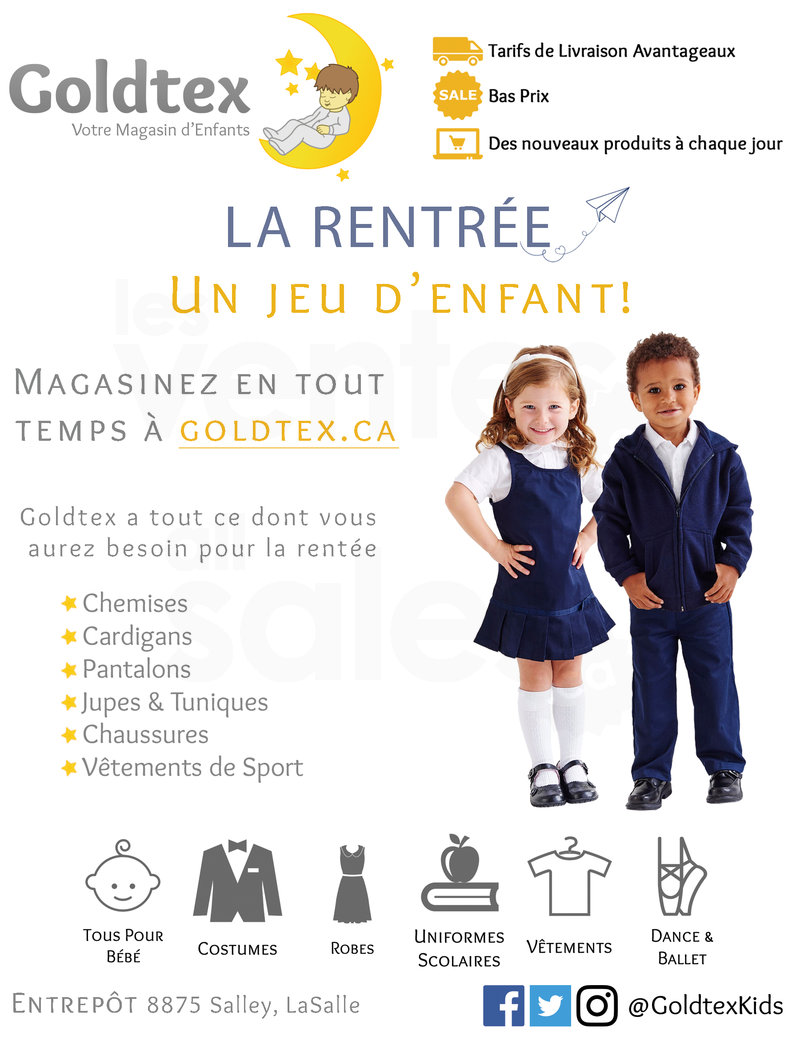 Très bons prix et grande sélection d'uniformes scolaires chez Goldtex! Tailles 0-16. Nous offrons aussi des vêtements pour toutes les occasions spéciales et pour tous les jours! Pour bébé: berceaux, literie, poussettes et beaucoup plus!