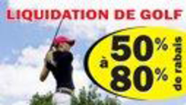Méga liquidation de golf - 3 jours seulement! Vêtements, souliers, balles, bâtons, ensemble complets, sacs, accessoires et plus. Tout pour le golf à prix imbattable! Plus de 1 000 000$ d'inventaire à liquider. Économisez de 50% à 80% sur tout!