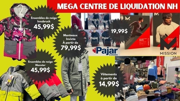 Beaucoup d'aubaines au Méga centre de liquidation NH! Profitez de rabais fous sur des marques telles que Pajar, Mission, Innsbruck, Monster, Invicta, etc! Habits de neige pour enfants, manteaux pour hommes et femmes, vêtements et plus!