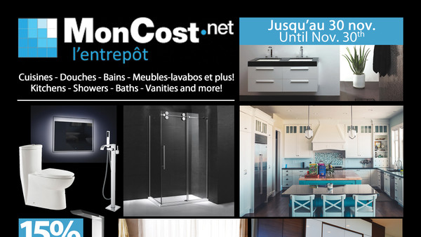 Jusqu'au 30 novembre chez MonCost.net l'entrepôt, rabais de 15% sur une superbe sélection de centaines de produits de cuisine et salles de bain! Douches, bains, meubles-lavabos, cuisines et plus - à prix d'entrepôt!