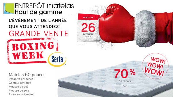 Grande vente du Boxing Day* chez Entrepôt de matelas Longueuil! Matelas haut de gamme Serta jusqu'à 70% de rabais, jusqu'à 48 versements égaux sans intérêts, et nous payons les 2 taxes. Recevez gratuitement des draps et oreillers en bambou!