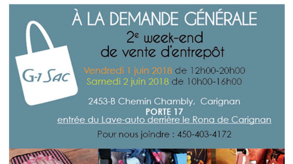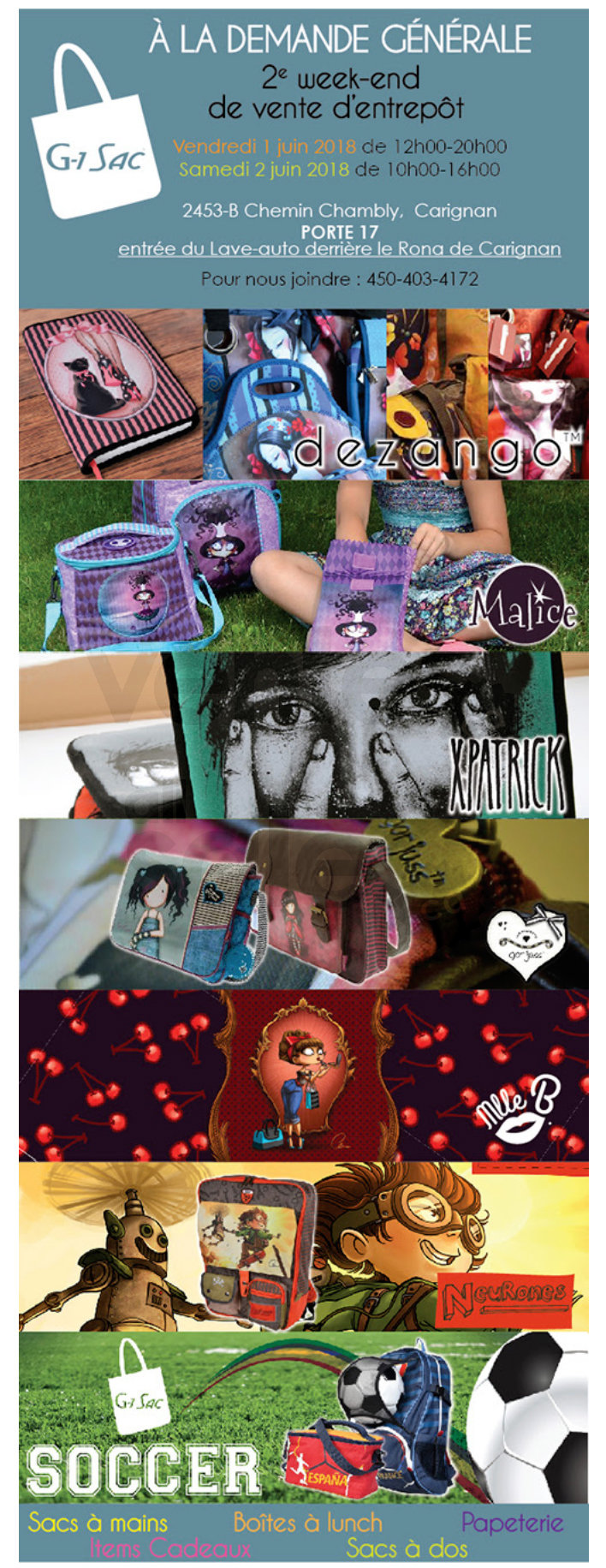 À la demande générale! 2e weekend de vente d'entrepôt les 1er et 2 juin! Économisez sur des sacs à main, des boîtes à lunch, de la papeterie, des sacs à dos et des items cadeaux. Dezango, Malice, XPatrick, gorJuss, Mlle B., Neurones & plus.