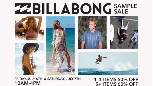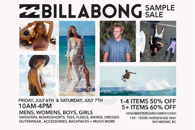 La vente d'entrepôt Billabong les 6 et 7 juillet à Richmond! Obtenez des rabais sur les chandails, t-shirts, bikini, robes, vêtements, sacs à dos, accessoires et bien plus!