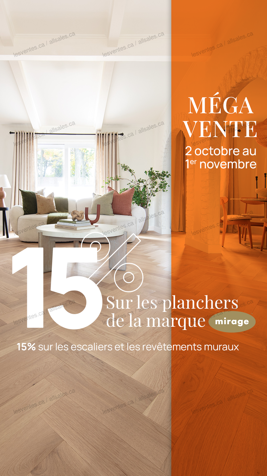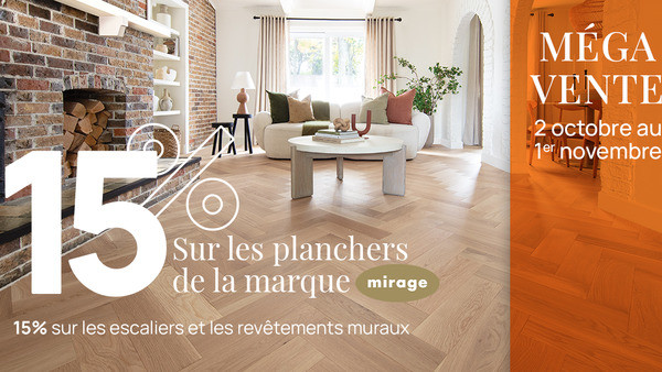 Méga vente d'automne chez Barwood-Pilon du 2 octobre au 1er novembre 2025! Planchers Mirage, escaliers, revêtements muraux, planchers flottants et de vinyle.