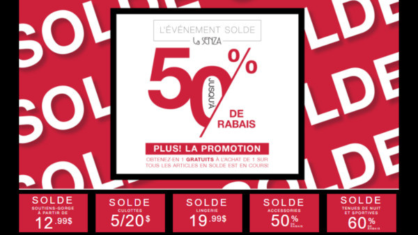 L'événement Solde la Senza passe à un autre niveau! Soutiens-gorge à partir de 12,99$, culottes 5 pour 20$, lingerie à 19,99$, tenues de nuit et sportives à 60% de rabais. Plus la promotion obtenez-en 1 gratuit à l'achat de 1 sur tous les soldes.