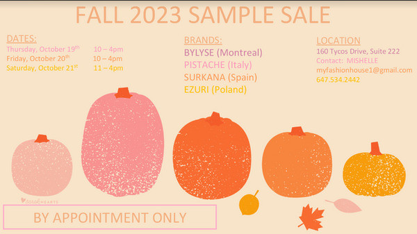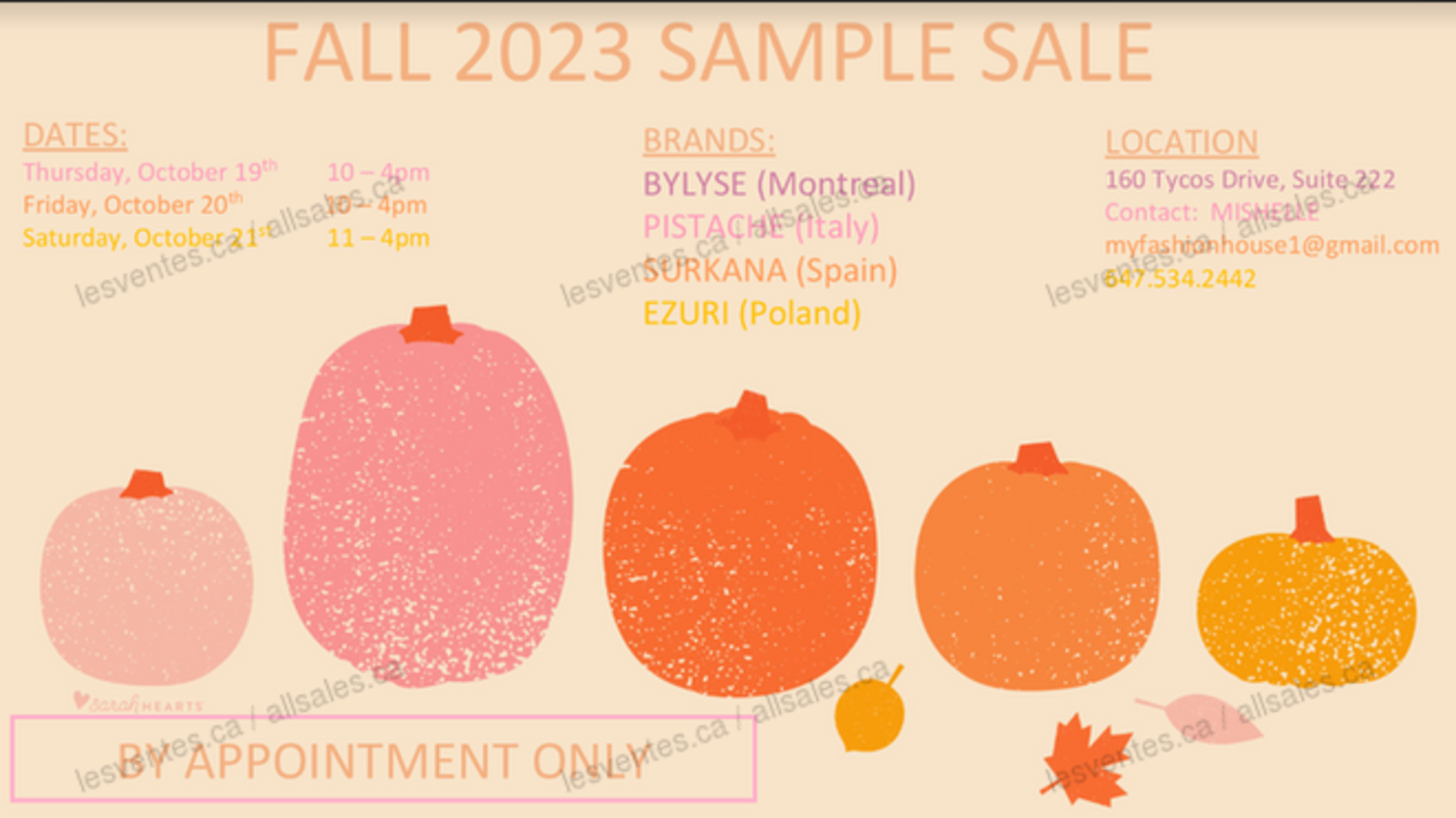 Vente d'échantillons ce weekend à Toronto. Magasinez les marques suivantes: Bylyse, Pistache, Surkana, Ezuri et plus. SUR RENDEZ-VOUS SEULEMENT. Contactez Mischelle 647-534-2442 / myfashionhouse1@gmail.com