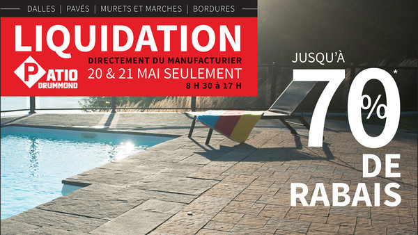 Liquidation directement du manufacturier Patio Drummond, les 20 et 21 mai 2017! Nous écoulons nos fins de lots, produits discontinués, légères imperfections. Pavés unis, dalles en béton, muret, bordures jusqu'à 70% de rabais ($0.99 / pi.ca.).