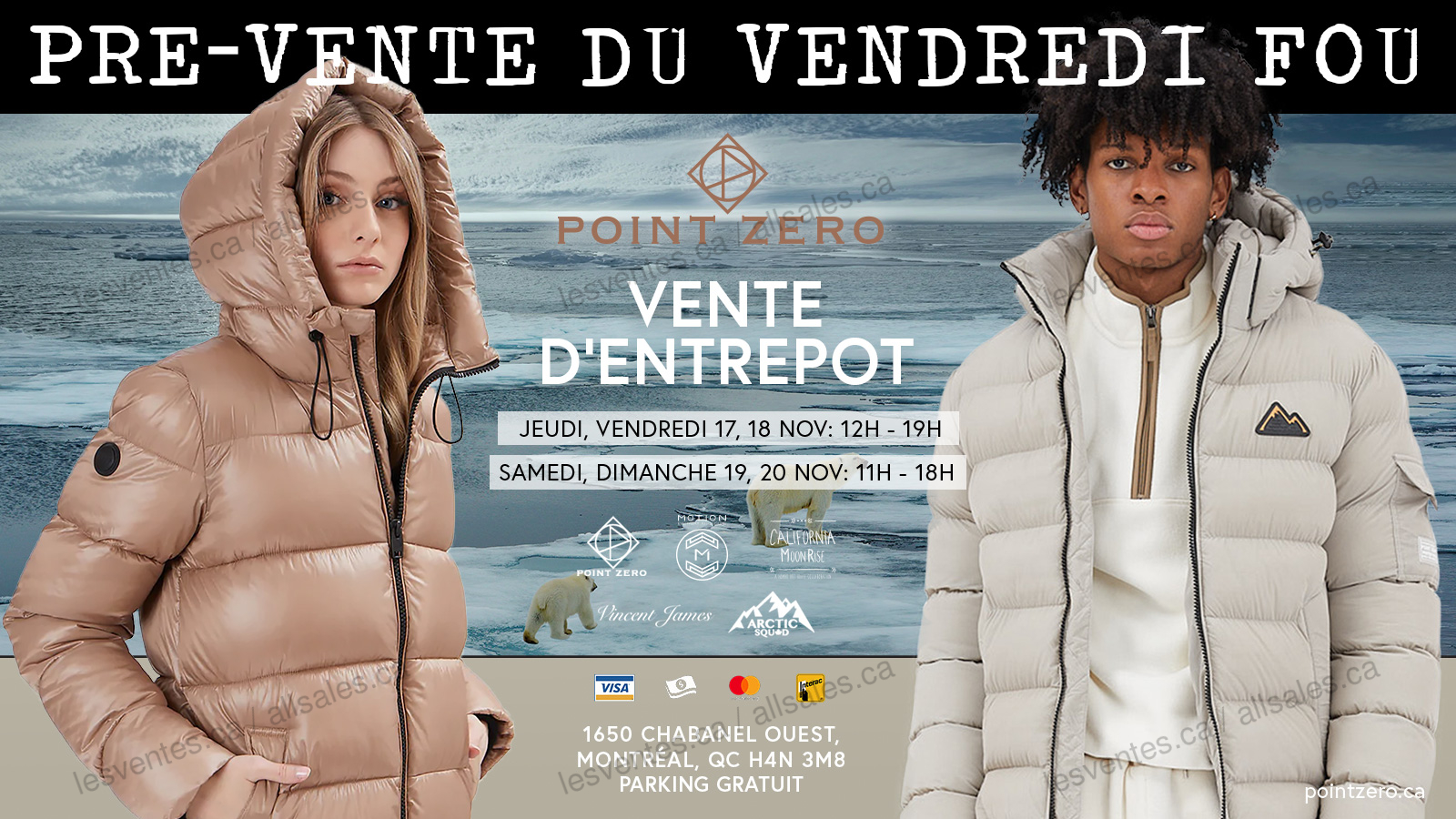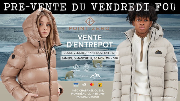 La vente d'entrepôt Point Zero est prolongée du 17 au 20 novembre 2022! Profitez de rabais jusqu’à 70% sur un vaste choix de vêtements pour hommes et femmes!