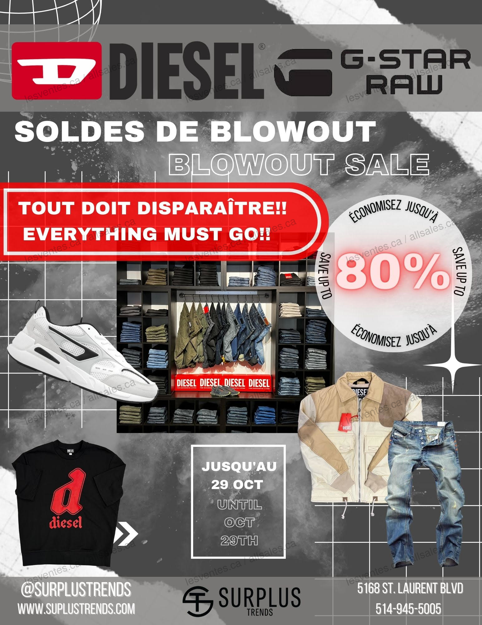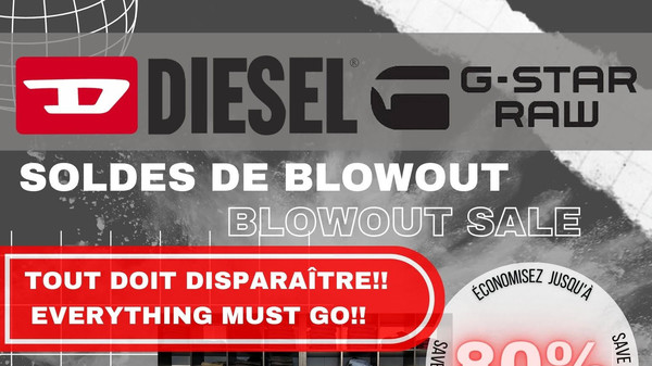 Ne manquez pas le solde Diesel et G-STAR RAW chez Surplus Trends! Jusqu'au 29 octobre économisez jusqu'à 80% sur les vêtements et chaussures pour hommes et femmes. Tout doit disparaître!