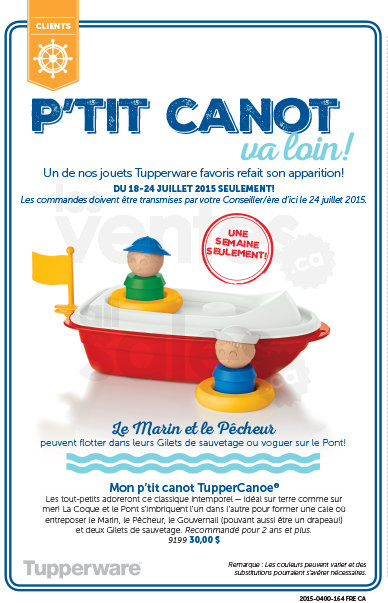 Procurez-vous un de nos jouets Tupperware favoris : Mon p'tit canot TupperCanoe. Disponible du 18 au 24 juillet seulement! Voyez plus d'aubaines dans notre brochure de juillet!