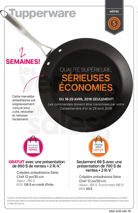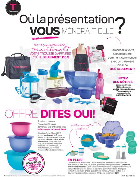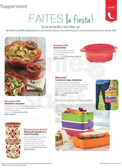 Jusqu'au 13 mai, l'ensemble Tupperware de 8 bols Grand-mère est seulement 94$ (rég. 193$), le service à boisson Tulipe 39$ (rég. 62$), l'ensemble à patisserie 43,50$ (valeur 68,50$)... Ne manquez pas toutes nos promotions dans les brochures en cours!