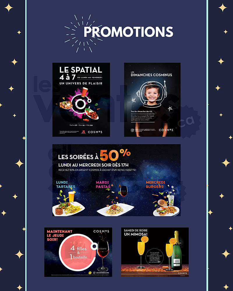 Le Cosmos vous gâte tous les jours de la semaine! Du lundi au vendredi, lors du Spatial 4 à 7 obtenez divers rabais sur la nourriture et l’alcool.