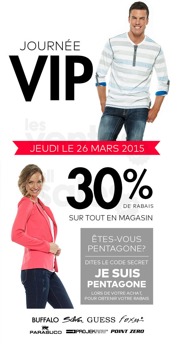 Le jeudi 26 mars, c'est la journée VIP chez Pentagone! Dites le code secret lors de votre achat pour obtenir votre rabais de 30% sur tout en magasin.