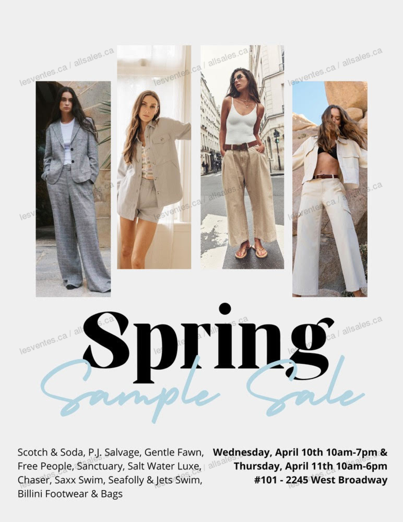 Vente d'échantillons du printemps à Vancouver les 10 et 11 avril. Scotch & Soda, P.J. Salvage, Gentle Fawn, Free People, Sanctuary, Salt Water Luxe, Chaser, Saxx Swim, Seafolly & Jets. Maillots, chaussures et sacs.