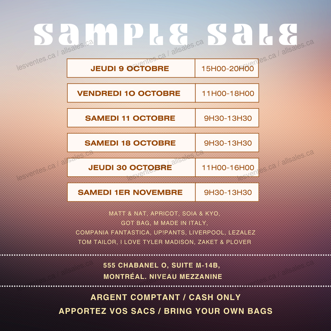 Vente d'échantillons automne 2025 Agence JLG les 9-10-11, 18, 30 octobre et le 1er novembre. Économisez sur des vêtements par Matt & Nat, Apricot, Soia & Kyo, Got Bag, M Made in Italy, Compania Fantastica, UP! Pants, I Love Tyler Madison et plus.