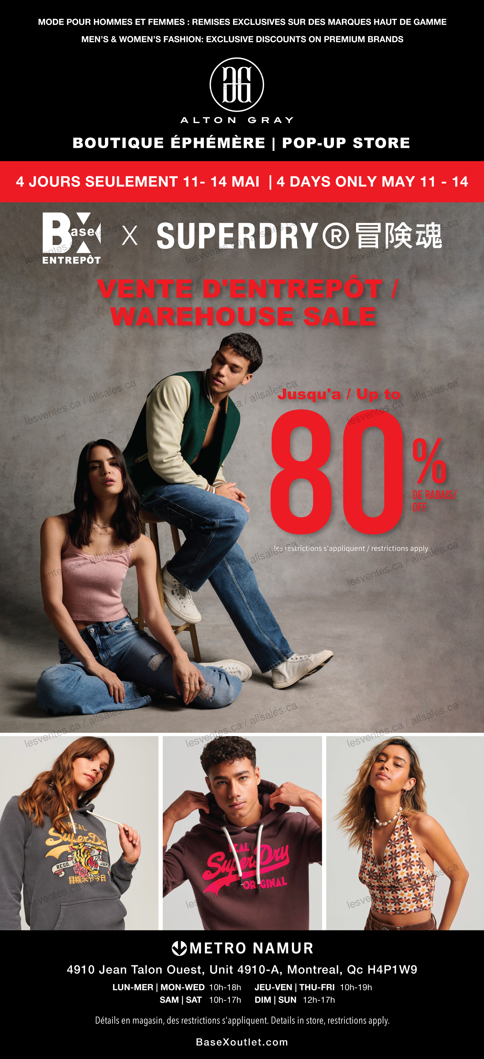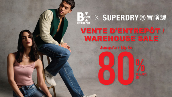 La vente d'entrepôt Base X Superdry se tiendra du 11 au 14 mai 2023! Jusqu'à 80% de rabais sur mode pour hommes et femmes. Remises exclusives sur des marques haut de gamme.