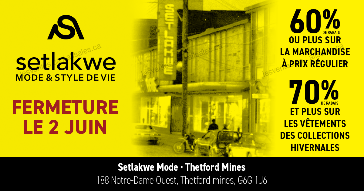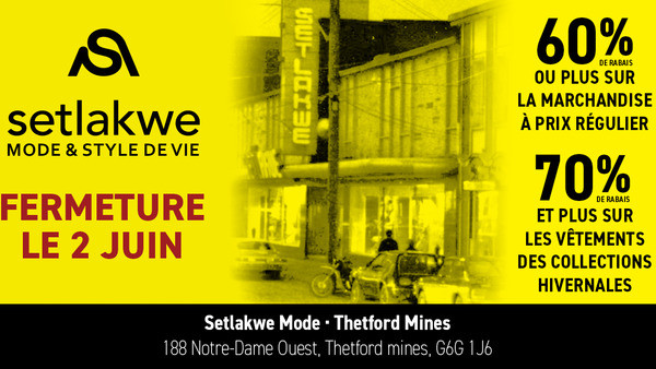 Vente de fermeture de la boutique Setlakwe mode à Thetford Mines jusqu'au 2 juin. 60% de rabais ou plus sur la marchandise à prix régulier. 70% de rabais ou plus sur les vêtements des collections hivernales.
