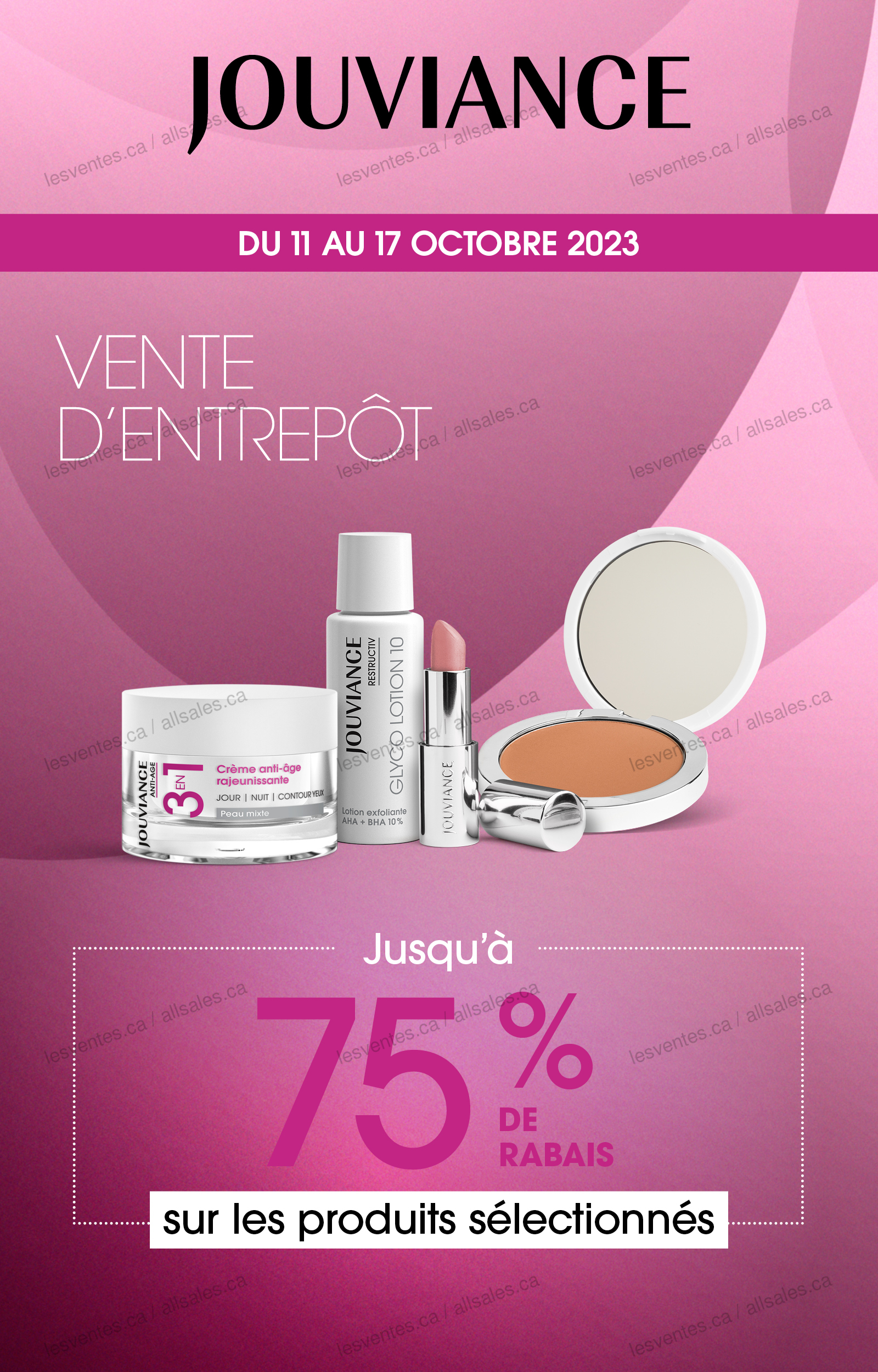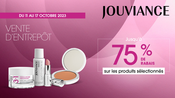 Du 11 au 17 octobre, vente d’entrepôt en ligne Jouviance. Une sélection de soins et de maquillage jusqu’à 75% de rabais. Des formules haute performance pour répondre aux besoins de chaque peau en matière d’hydratation et d’anti-âge.