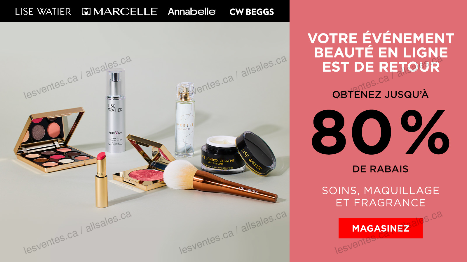 C'est le retour de notre vente d’entrepôt en ligne jusqu'au 31 janvier 2024! Jusqu'à 80% de rabais! Magasinez des produits de vos marques canadiennes préférées: Lise Watier, Marcelle, Annabelle & CW Beggs and Sons.