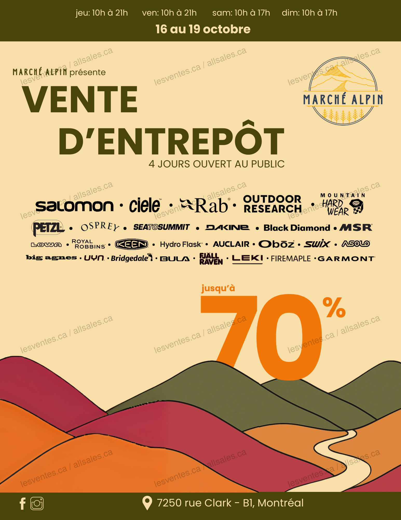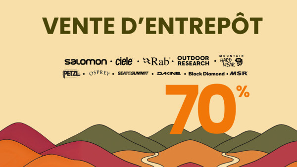 Vente d'entrepôt chez Marché Alpin du 16 au 19 octobre. Profitez de remises exceptionnelles de jusqu'à 70% sur des milliers de produits. Plusieurs vêtements et d'équipements pour profiter de l'automne!