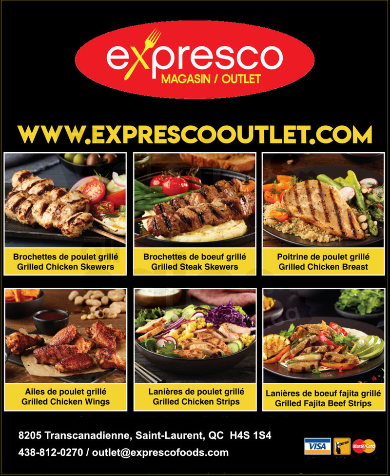 Expresco magasin offre des produits entièrement cuits à des prix en gros. Parfait pour les BBQ, les restaurants, et plus. Brochettes de poulet, bœuf et porc grillées, ailes de poulet, lanières de poulet et boeuf, pita et plus encore!