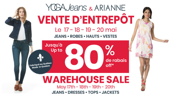 Première vente d'entrepôt YOGA Jeans et ARIANNE, 4 jours seulement! Du 17 au 20 mai, venez profitez de rabais jusqu'à 80%* et taxes incluses sur des jeans, robes, hauts et vestes pour femmes. Fabriqué au Québec!
