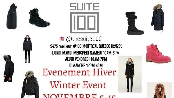 Passez à la boutique Suite 100 à Montréal du 5 au 15 novembre pour découvrir les nouveautés et promotions! Magasinez les manteaux et bottes d'hiver tendances: Soia & Kyo, Rudsak, Pajar, Timberland, UGG, Parajumpers et plusieurs autres marques!