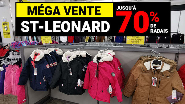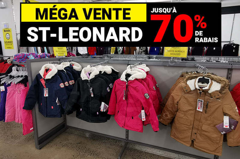 Méga vente d’entrepôt à St-Léonard! Venez magasiner des manteaux, vêtements & accessoires pour toute la famille à des prix incroyables. Rabais jusqu'à 70% sur Jack & Jones, Bench, Buffalo, Puma, Champion et plusieurs autres! Ouvert 7 jours/semaine.