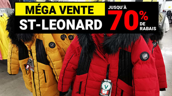 Méga vente d’entrepôt à St-Léonard! Venez magasiner des manteaux, vêtements & accessoires pour toute la famille à des prix incroyables. Rabais jusqu'à 70% sur Jack & Jones, Bench, Buffalo, Puma, Champion et plusieurs autres! Ouvert 7 jours/semaine.