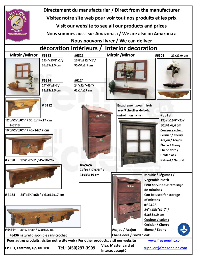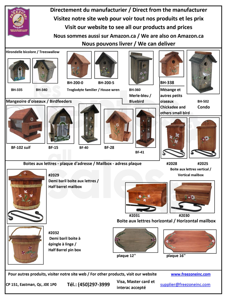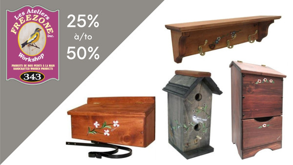 Grande vente d’inventaire des Ateliers Freezone à Bolton-Est, fabricant d'articles de décoration en bois peints à la main. Jusqu’à -25% sur les boîtes aux lettres, jusqu’à -30% sur la déco intérieure et jusqu’à -50% sur les porte-clés muraux.