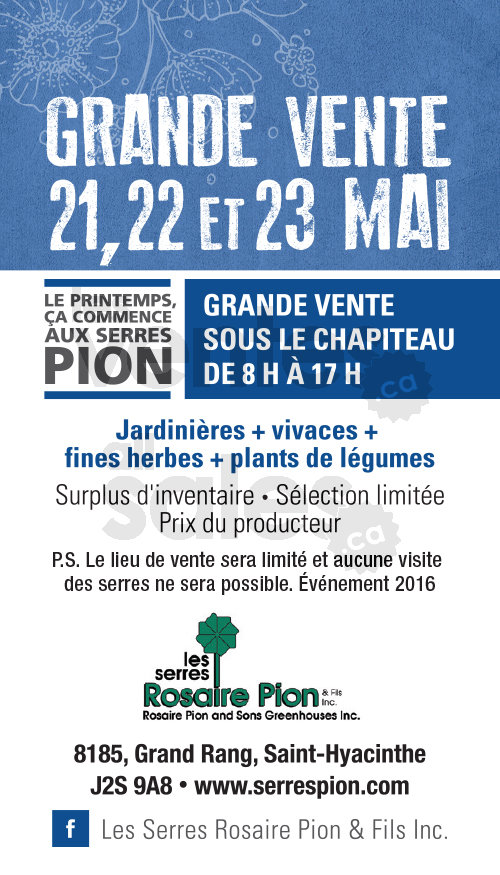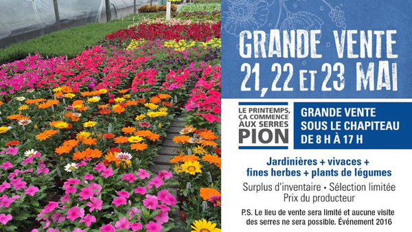 Grande vente sous le chapiteau de jardinières, vivaces, fines herbes et plants de légumes du 21 au 23 mai, aux Serres Rosaire Pion & Fils à Saint-Hyacinthe. Surplus d'inventaire, vous payez le prix du producteur. On vous y attend!