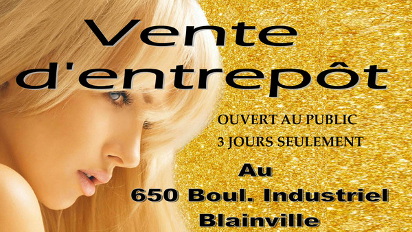 Vente d’entrepôt de produits de coiffure et esthétique professionnel les 28-29-30 avril et 5-6-7 mai à Blainville. Rabais jusqu’à 50% sur produits et accessoires pour hommes et femmes: gels, fixatifs, séchoirs, fers plats, maquillage et plus.