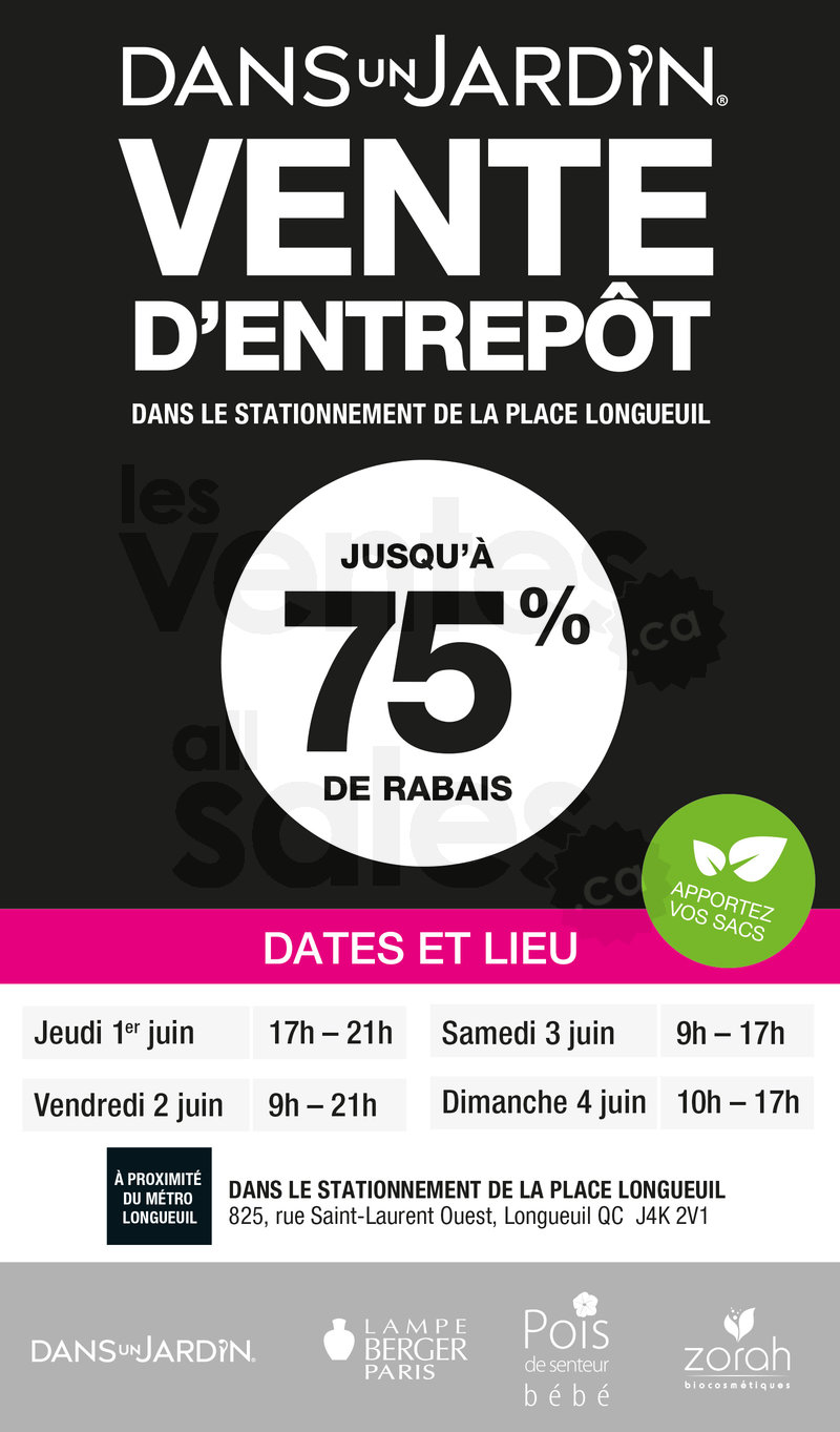 La grande vente d’entrepôt Dans un Jardin est de retour du 1er au 4 juin! Profitez de rabais allant jusqu’à 75%. Vous trouverez les produits des marques : Dans un Jardin, Komyo, Mûre sauvage, Pois de senteur, Princesse Jujube, Lampe Berger, zorah.