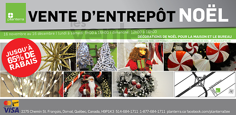 Planterra ouvre ses portes au public jusqu'au 16 déc. pour une vente de décorations de Noël! Économisez gros sur tout notre inventaire jusqu'à 65% de rabais. Arbres de Noël, arbres alpins, couronnes, lumières, gnomes, boules de Noël et bien plus.