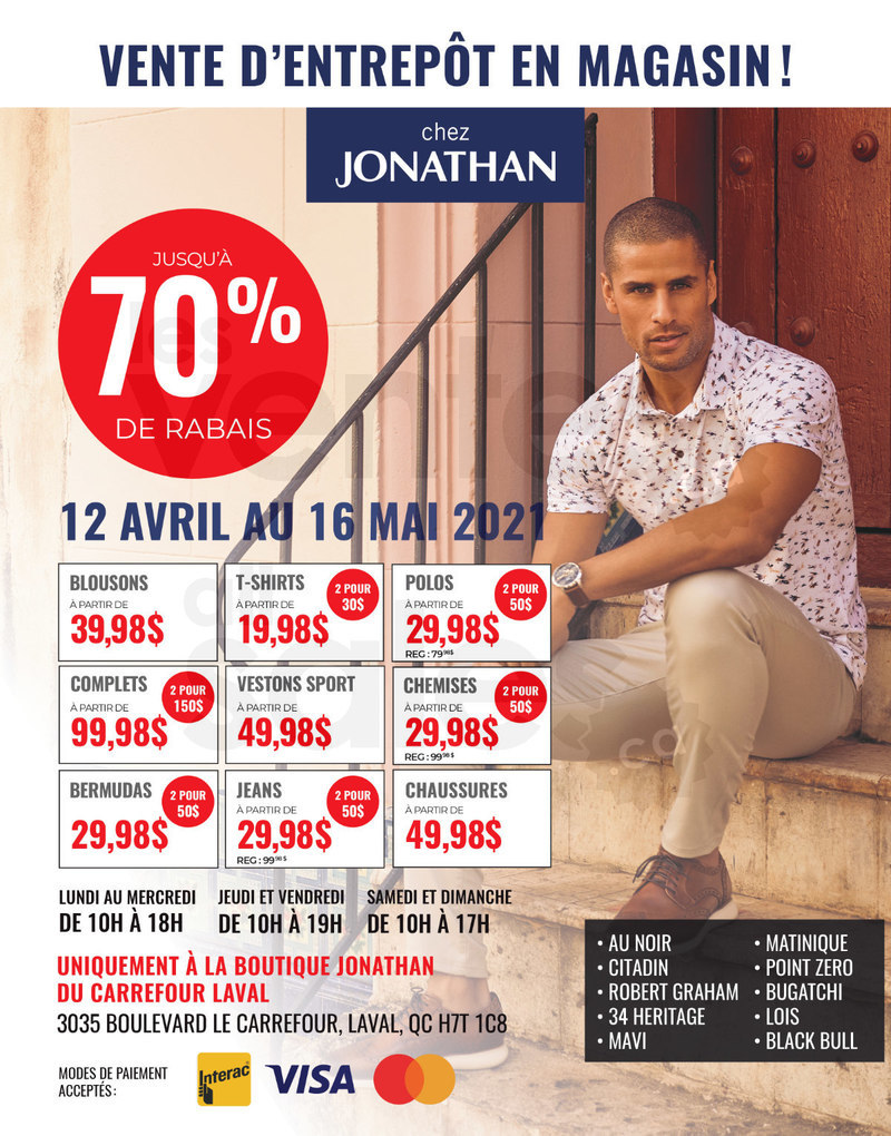 Du 12 avril au 16 mai 2021, obtenez jusqu'à 70% de rabais sur la marchandise sélectionnée chez Boutique Jonathan du Carrefour Laval. Obtenez des vêtements pour hommes de qualité à un prix jamais vu!