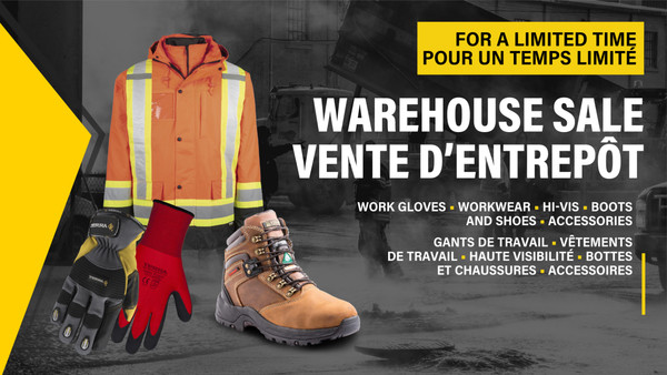 Grande vente d'entrepôt jusqu'au 14 juin à Montréal ! Variété d’échantillons et de produits discontinués de marque Horizon, Terra, Dickies, Holmes Workwear, etc. Gants, manteaux, vestes, ensembles de pluie et bien plus seront disponibles.
