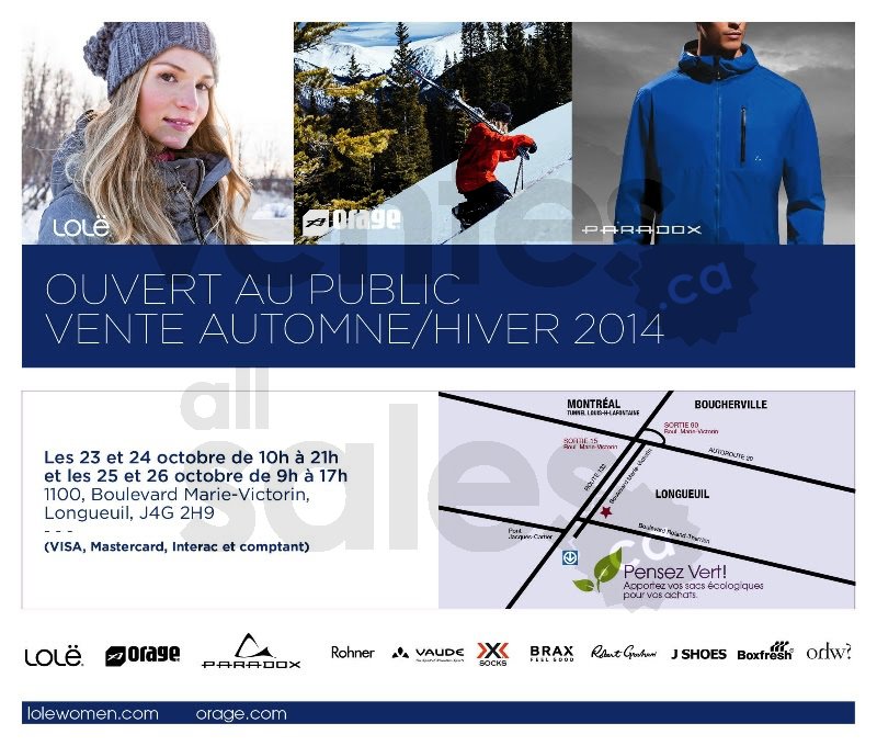 Ne manquez pas la vente d'entrepôt automne / hiver 2014 Lolë, Orage et Paradox, du 23 au 26 octobre prochain! Profitez de rabais exceptionnels sur des vêtements pour homme et femme. Nos marques: Lolë, Paradox, Orage, Rohner, Vaude, Socks, Brax....
