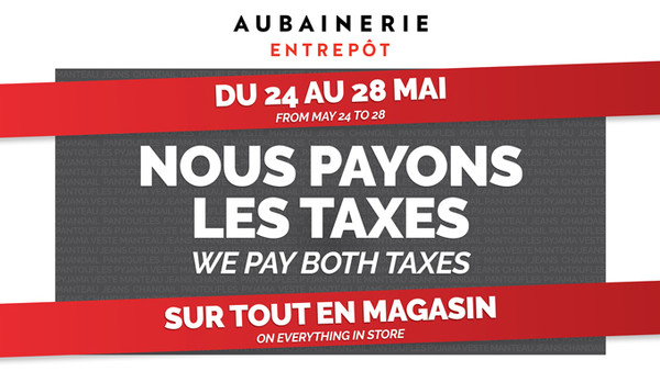 À la recherche de vêtements abordables pour toute la famille ? Du 24 au 28 mai 2017 inclusivement, Aubainerie Entrepôt paie les taxes* sur tout en magasin. Le rabais est équivalent au montant des deux taxes. Ne manquez pas cette occasion!