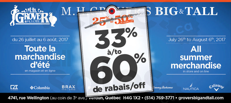Jusqu'au 6 août, grande vente d'été avec des rabais de 33% à 60% chez M. H Grover & Sons! Vêtements pour l'homme grand et fort, nous offrons polos, shorts, jeans, habits, vêtements sport, etc. BRAX, Tommy Bahama, Nautica, Callaway, Cutter & Buck.