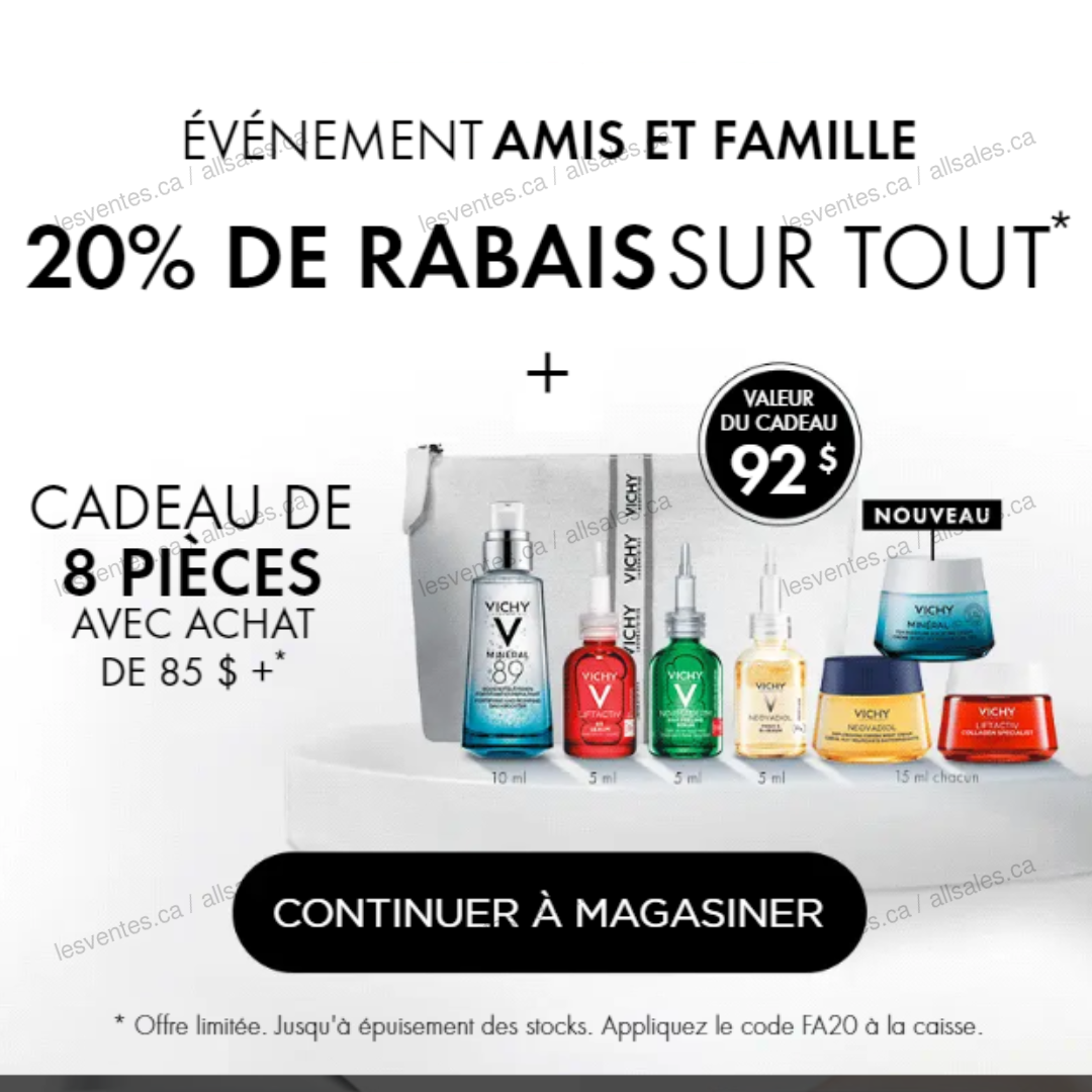 L'événement amis et famille de Vichy est de retour! 20% de rabais sur tout et profitez d'un cadeau de 8 pièces avec achat de 85$ +. Valeur du cadeau de 92$! Appliquez le code FA20 à la caisse.